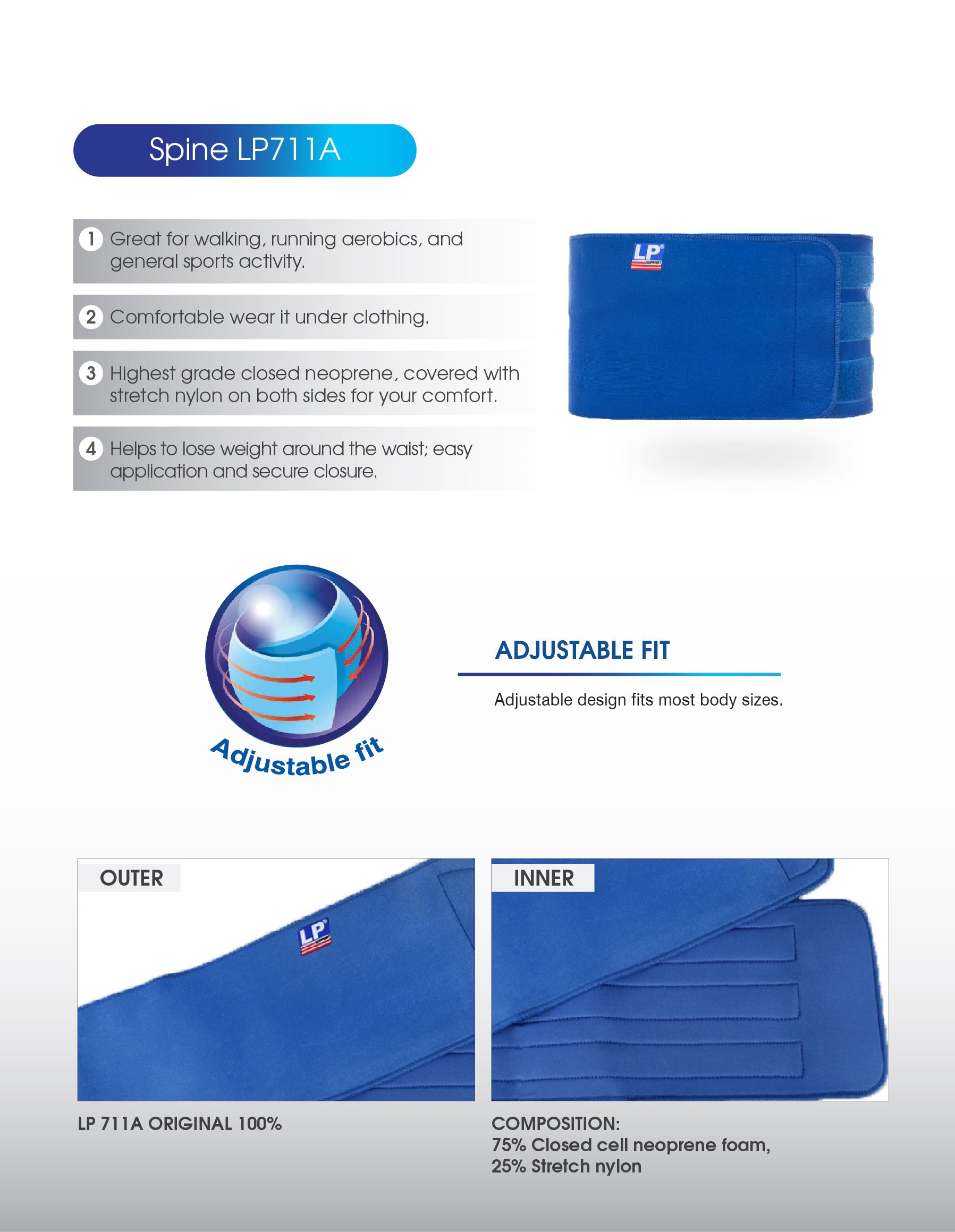For lower back support and abdominal lift. Effective in toning and shaping waistline when worn during athletic activity. Helps provide constant heat and moisture to lower back muscles. 1/8" thick neoprene with a double knit nylon exterior.