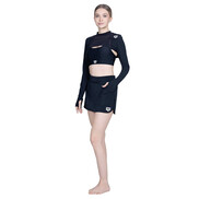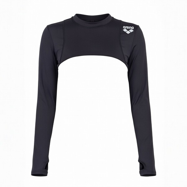 This swim cover top has a clean and modern look with a cropped design. The long sleeves and high neckline provide extra coverage while keeping the style simple.