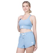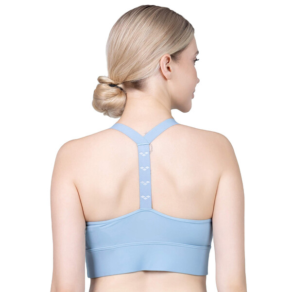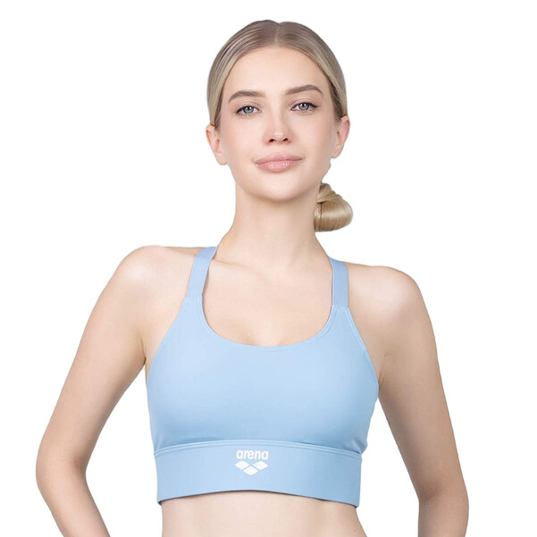 This sports bra-style swim top offers a comfortable, secure fit with durable branded straps and a wide underbust band, making it perfect for active swimmers and water sports enthusiasts.