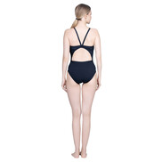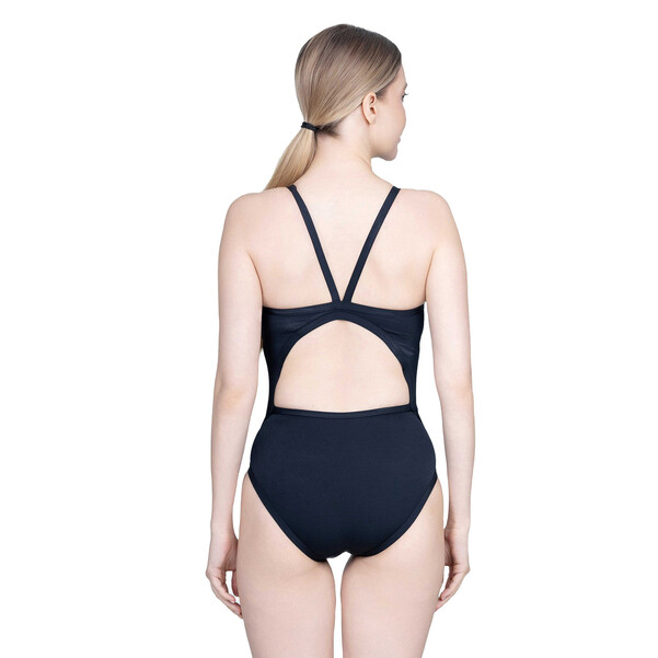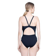 This one-piece swimwear features a clean, streamlined look with a flattering fit designed for everyday swimming. The simple front silhouette is complemented by an open-back design with secure straps, adding a modern touch while allowing easy movement.