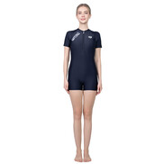 This short-sleeve one-piece swimwear features a sleek, modern silhouette with a clean and structured look. The front zip design allows for easy wear while keeping the overall style neat and streamlined.