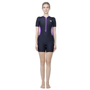 A streamlined one-piece designed for comfort and performance. Featuring a front zip for easy wear and a supportive, form-fitting silhouette, it allows natural movement in the water. Short sleeves provide added coverage, while the clean panel design enhances a modern, sporty look.