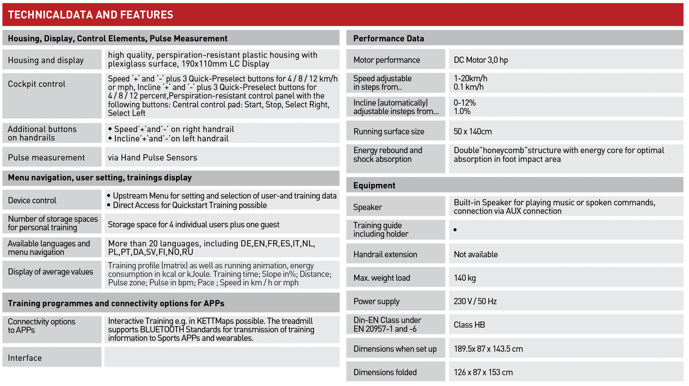 Kettler Track S6 equipped with a DC Motor 3.0 HP that allows you to reach a maximum speed of 20 km/h, starting from a minimum of 1 km/h, with increments in steps of 0.1 km/h. Incline electronically adjusted by up to 12% via the buttons on the console step by 1% at a time. The running surface is 50 x 140 cm, cushioned by the patented Adidas Energy Boost system. Housing and display: High quality, perspiration-resistant plastic housing with plexiglass surface, 190x110mm LC Display.