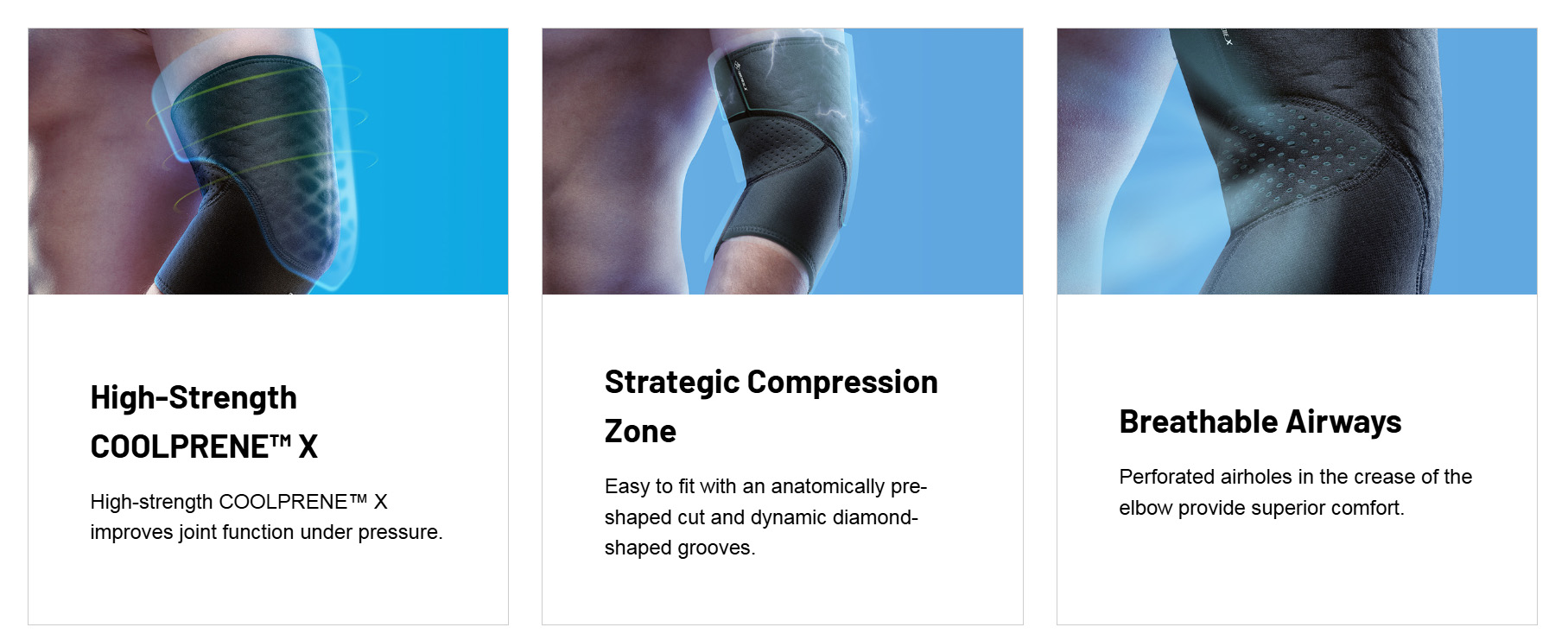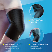 LP FT55CA ELBOW SLEEVE is designed to provide better contoured, form-fitting support during elbow movement. Strategically-placed COOLPRENE™ X reinforces the elbow joint and key muscles to help athletes withstand the demands of intense training.