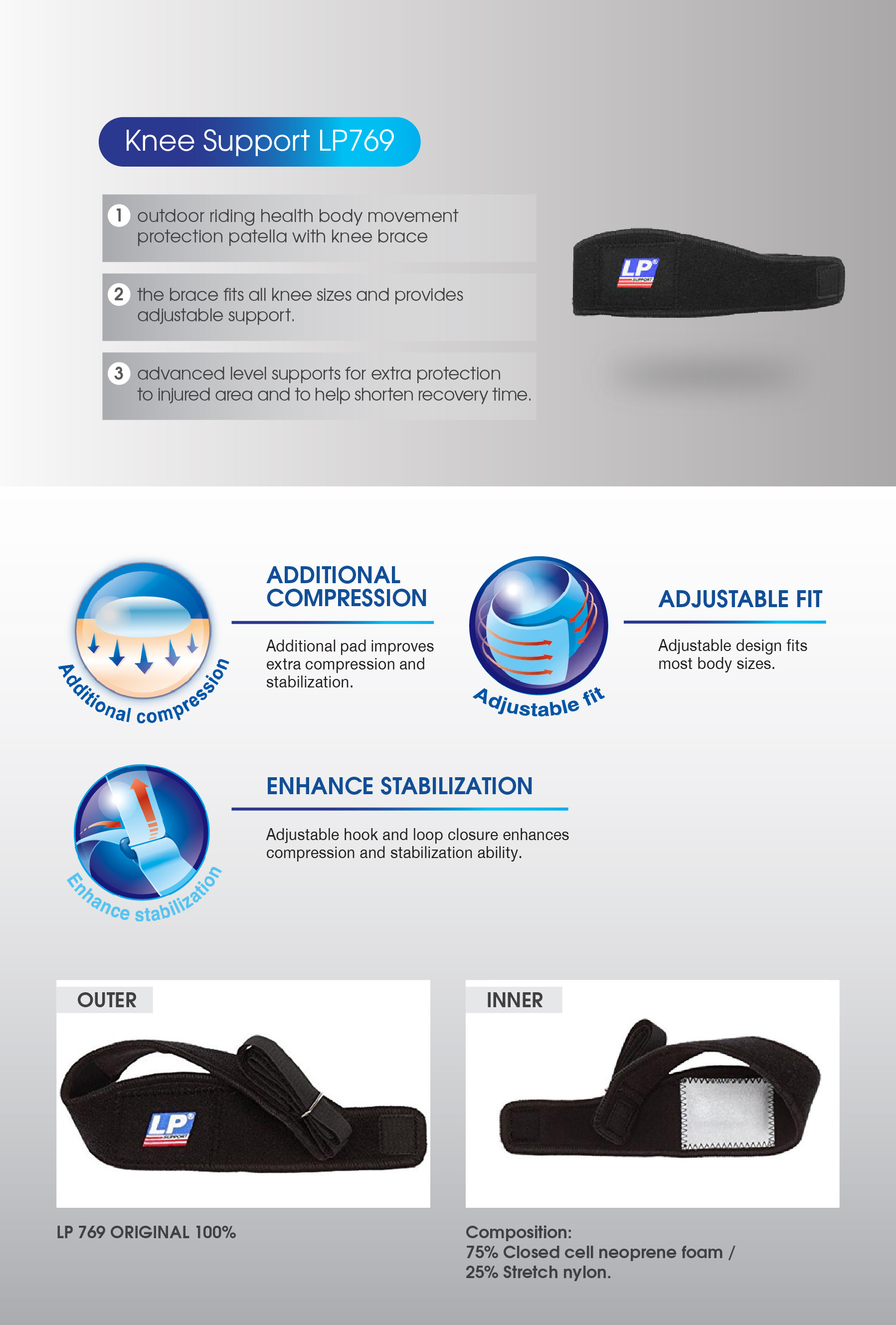Applies pressure on the patellar tendon to assist with correct tracking. Provides symptomatic relief of pain and inflammation associated with overuse injuries such as Patellofemoral syndrome, jumper's knee, and Osgood Schlatter.